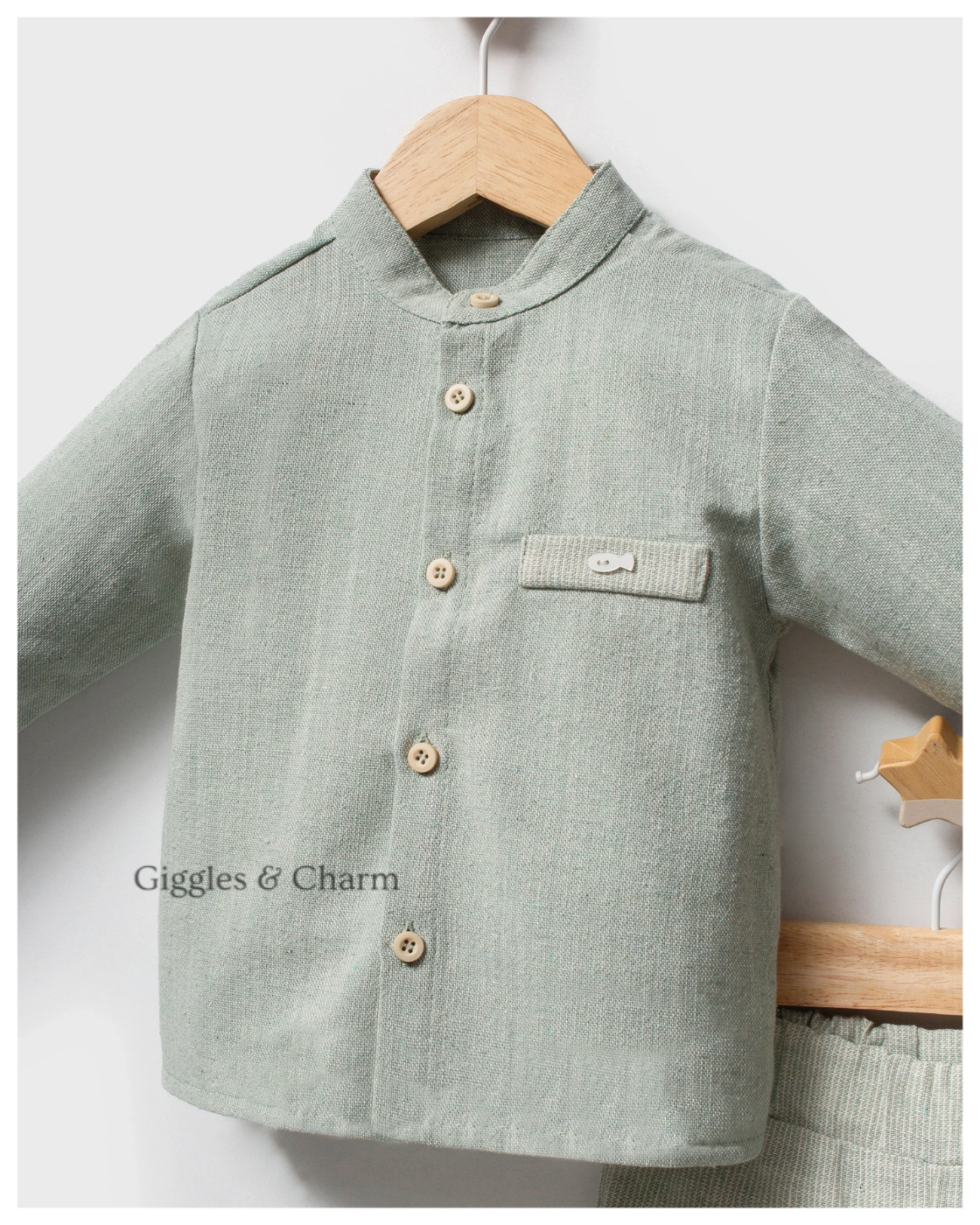 Sage green elegant Linen shirt with Mandarin collar, a cute fish cut button detail paired with matching elastic waist 100% cotton pants. Long sleeves with breathable fabric is perfect for all day comfort. An elegant set with subtle details.