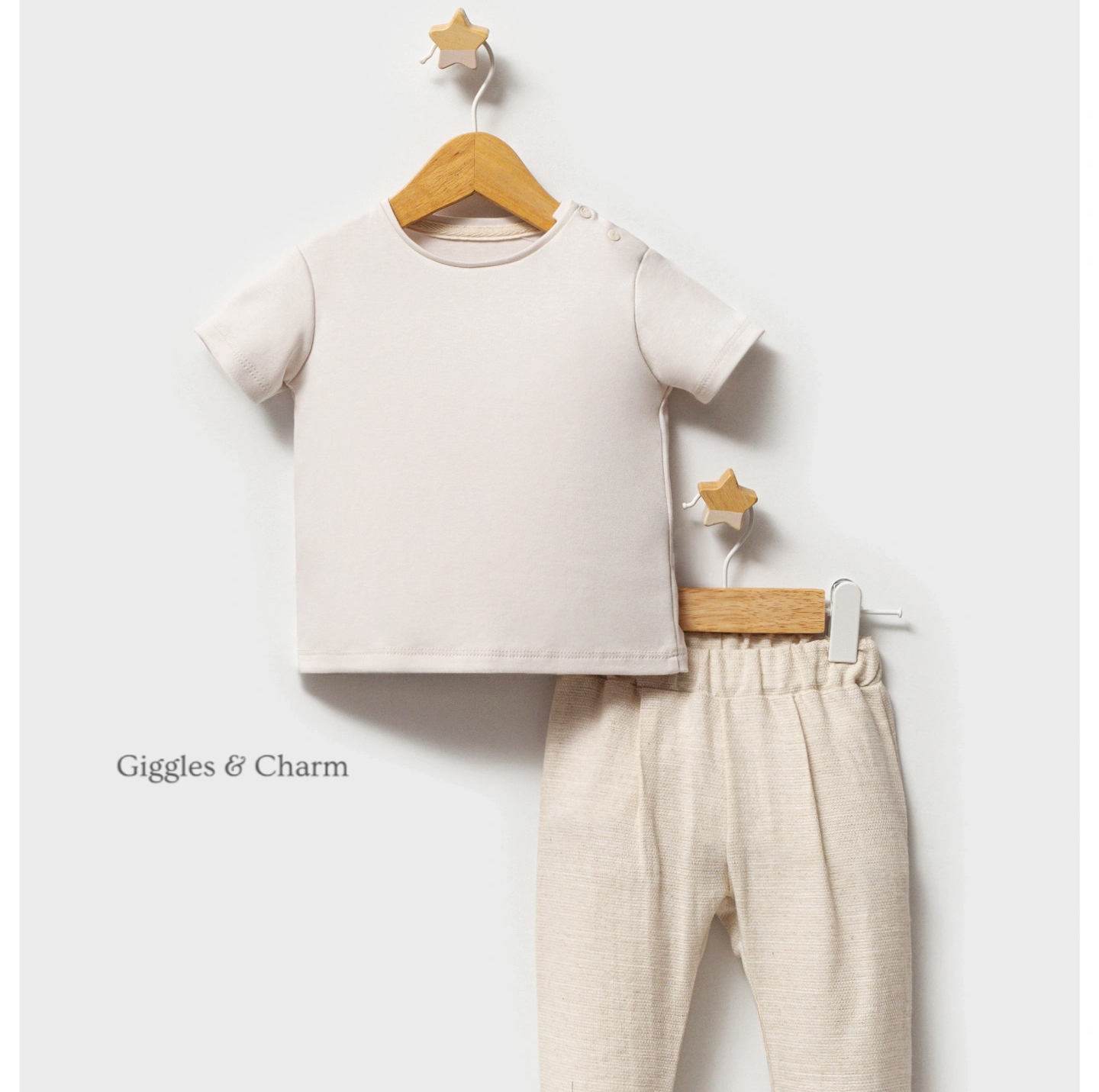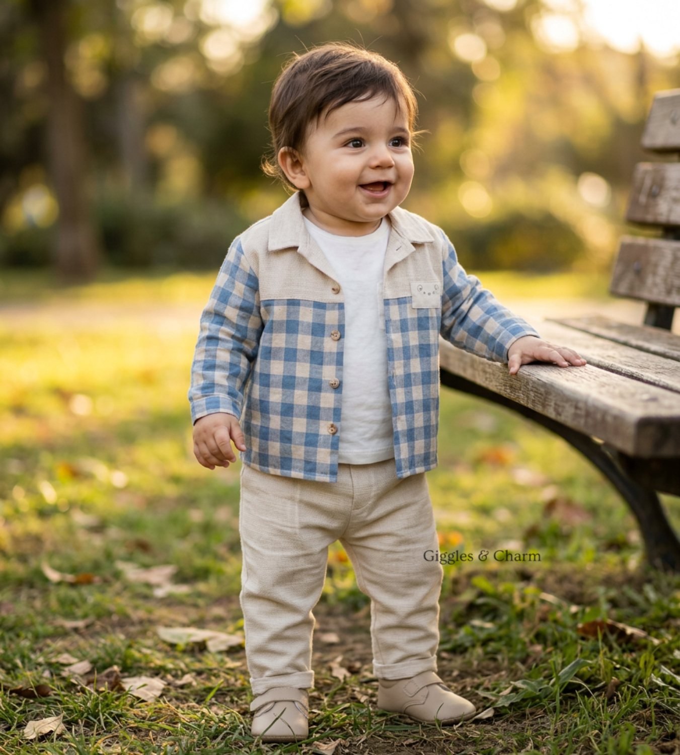 Blue and white gingham long-sleeve button-front shirt with notched collar and patch pocket pairs with cream wide-leg elasticised waist pants. Also comes with a matching cream soft tee with shoulder snapbuttons for ease of wear! Textured cotton fabric offers durability and softness, perfect for boys.