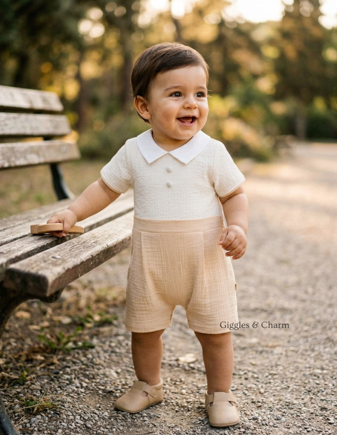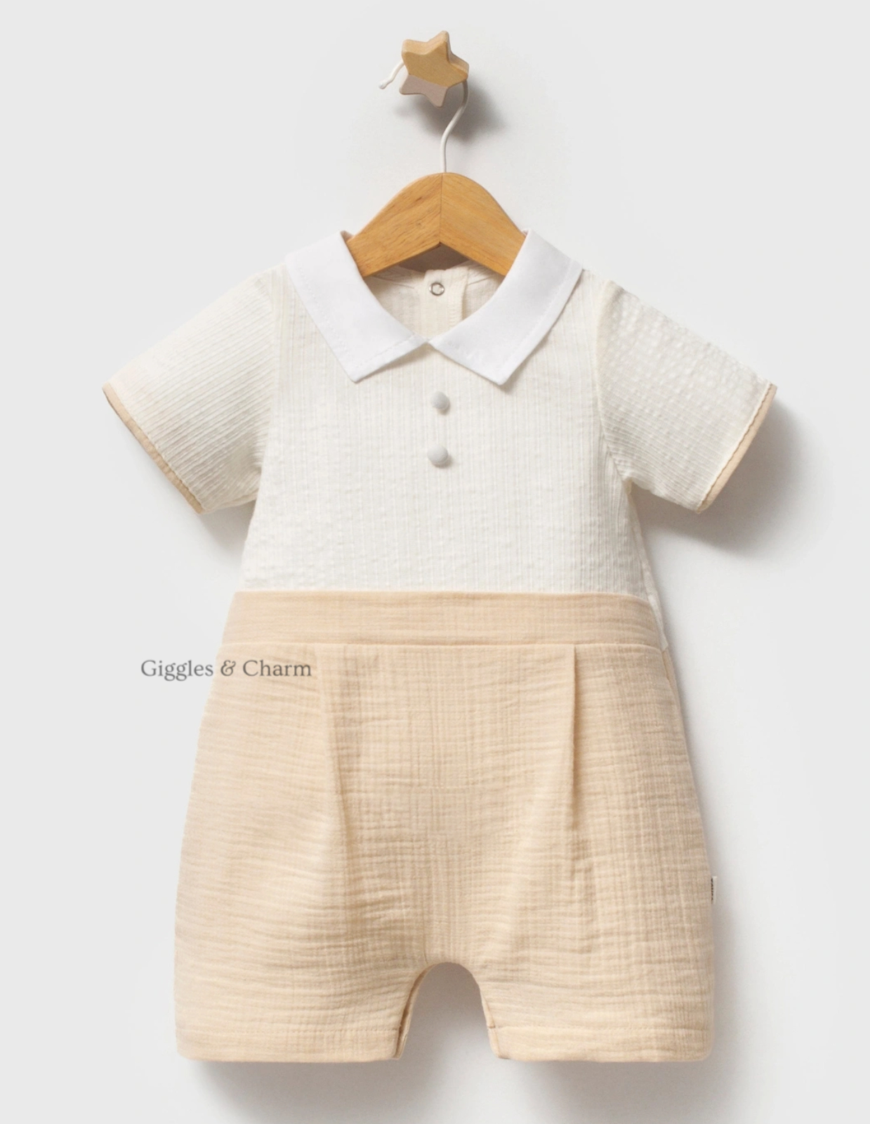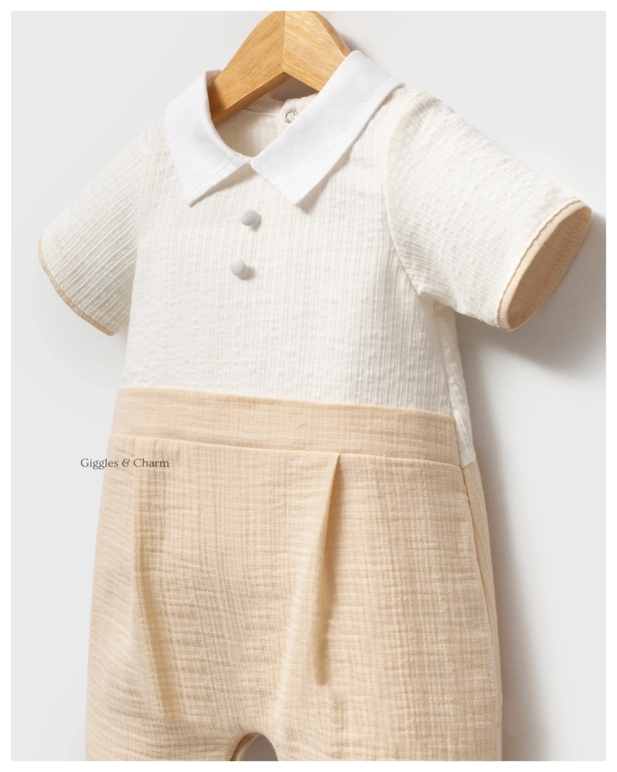 Short-sleeve boys’ romper combines a yellow-and-white striped collared bodice with a solid light yellow textured short bottom. Pleat detailing on the shorts and a crisp white collar add tailored sophistication, while snap closures ensure practicality. Crafted from soft, breathable muslin-blend fabric for comfortable, all-in-one dressing.