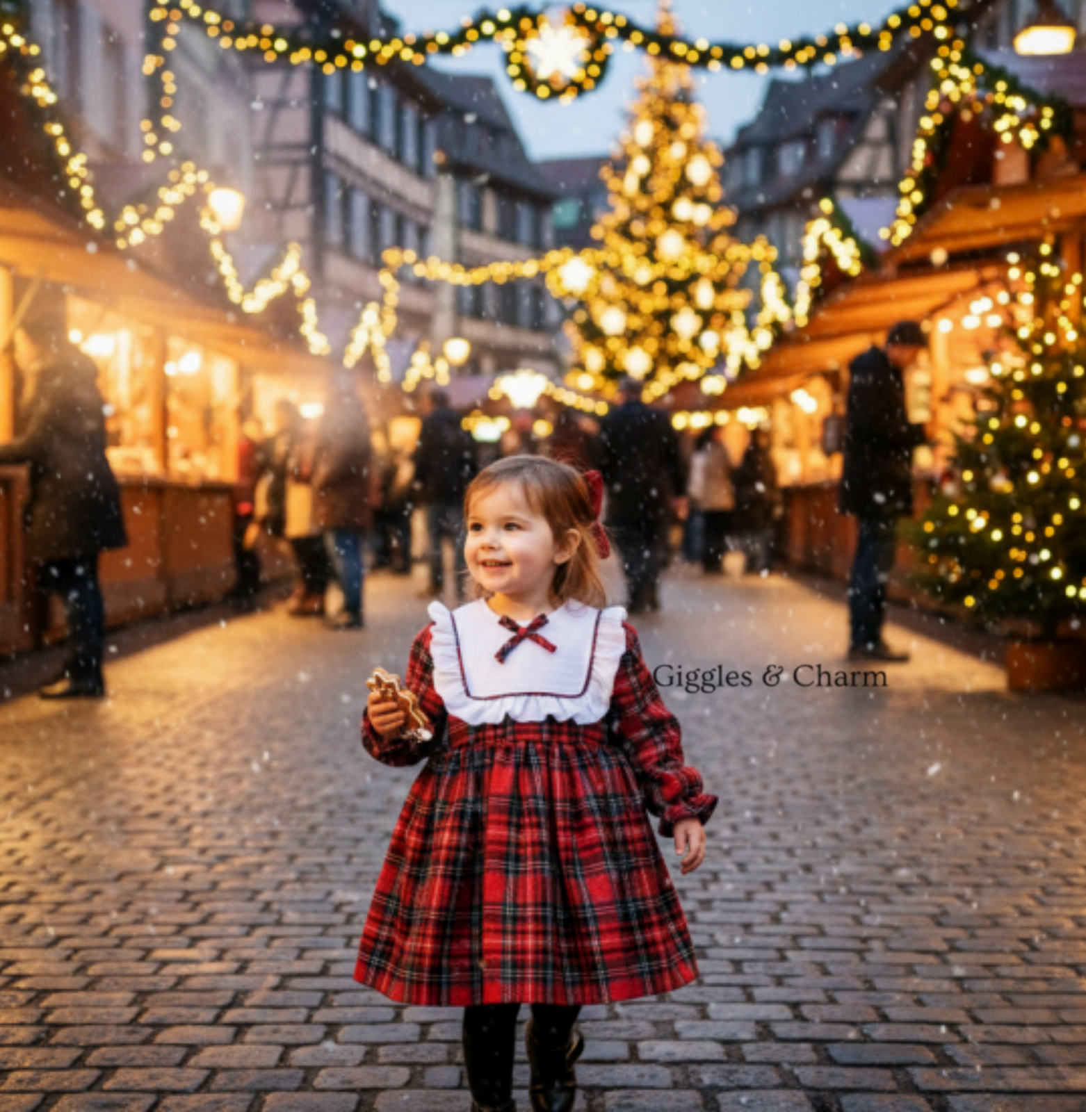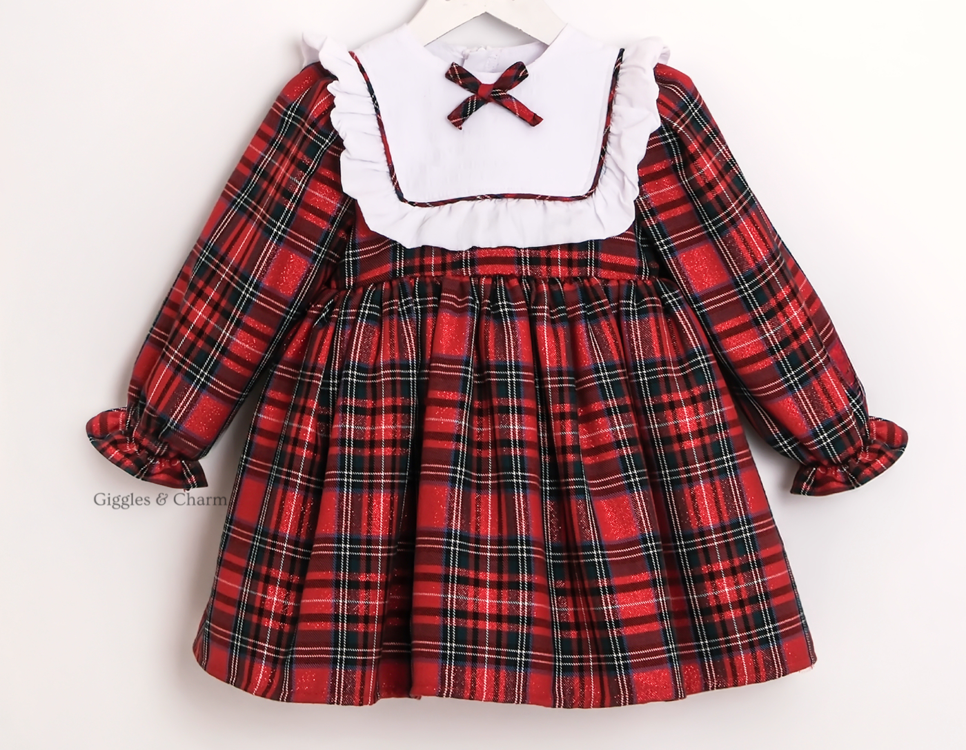 The warm long-sleeved red and black plaid festive dress features a white bib collar, ruffles, and a small plaid bow at the neckline, creating a classic look for the holiday season.