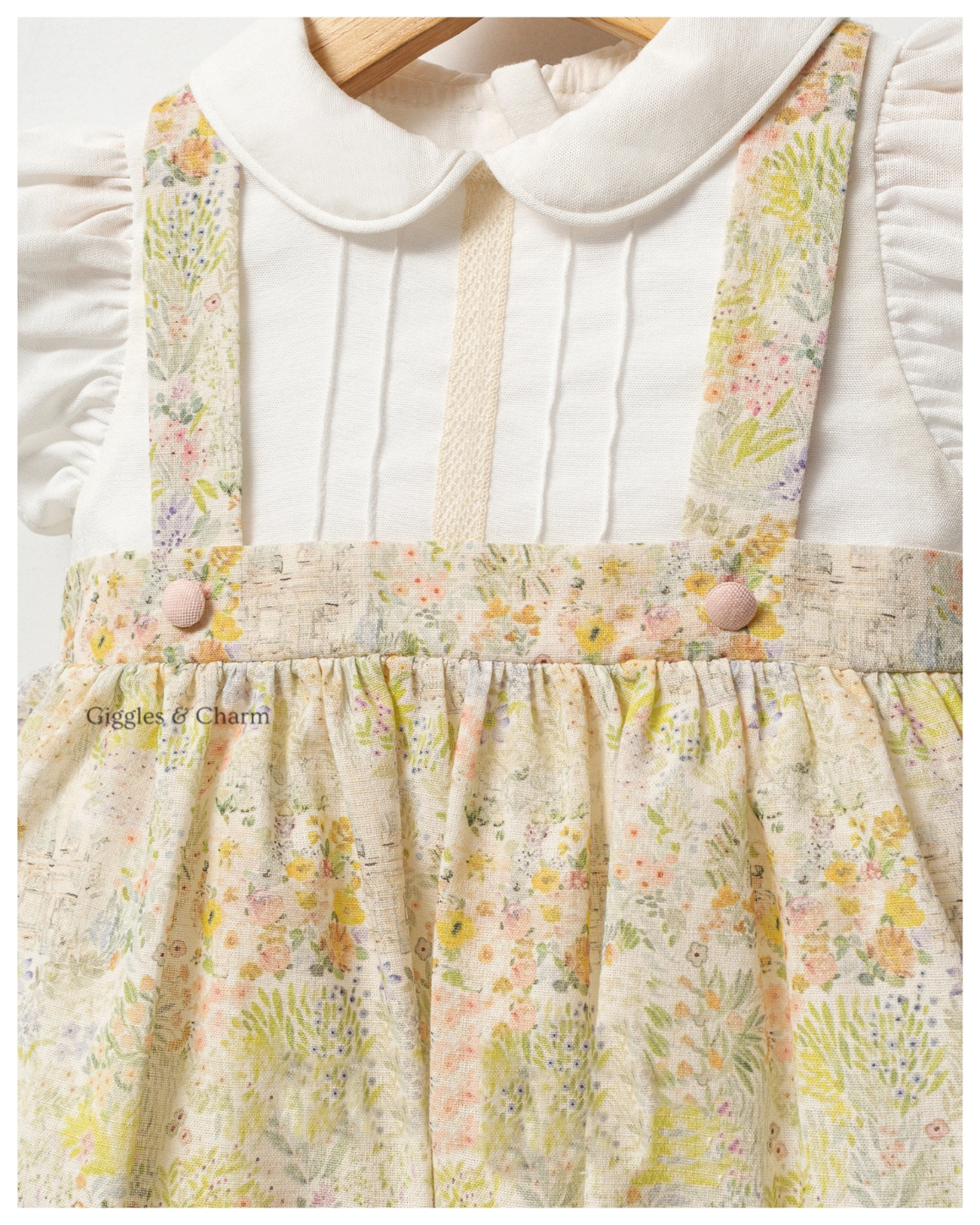 Delicate floral print pinafore dress features a gathered skirt and shoulder straps accented with pink buttons. Layered over a built-in short-sleeve white blouse detailed with a classic Peter Pan collar and flutter sleeves. This sweet, spring-inspired set includes two matching floral hair bows for a perfectly coordinated look.?