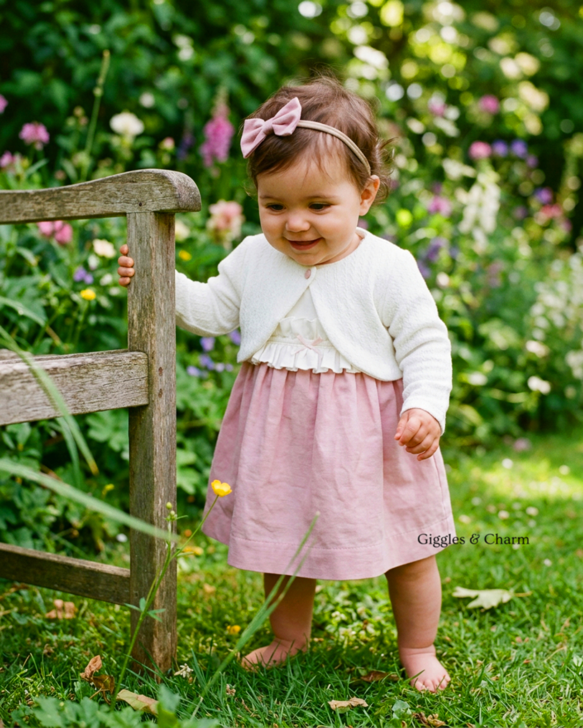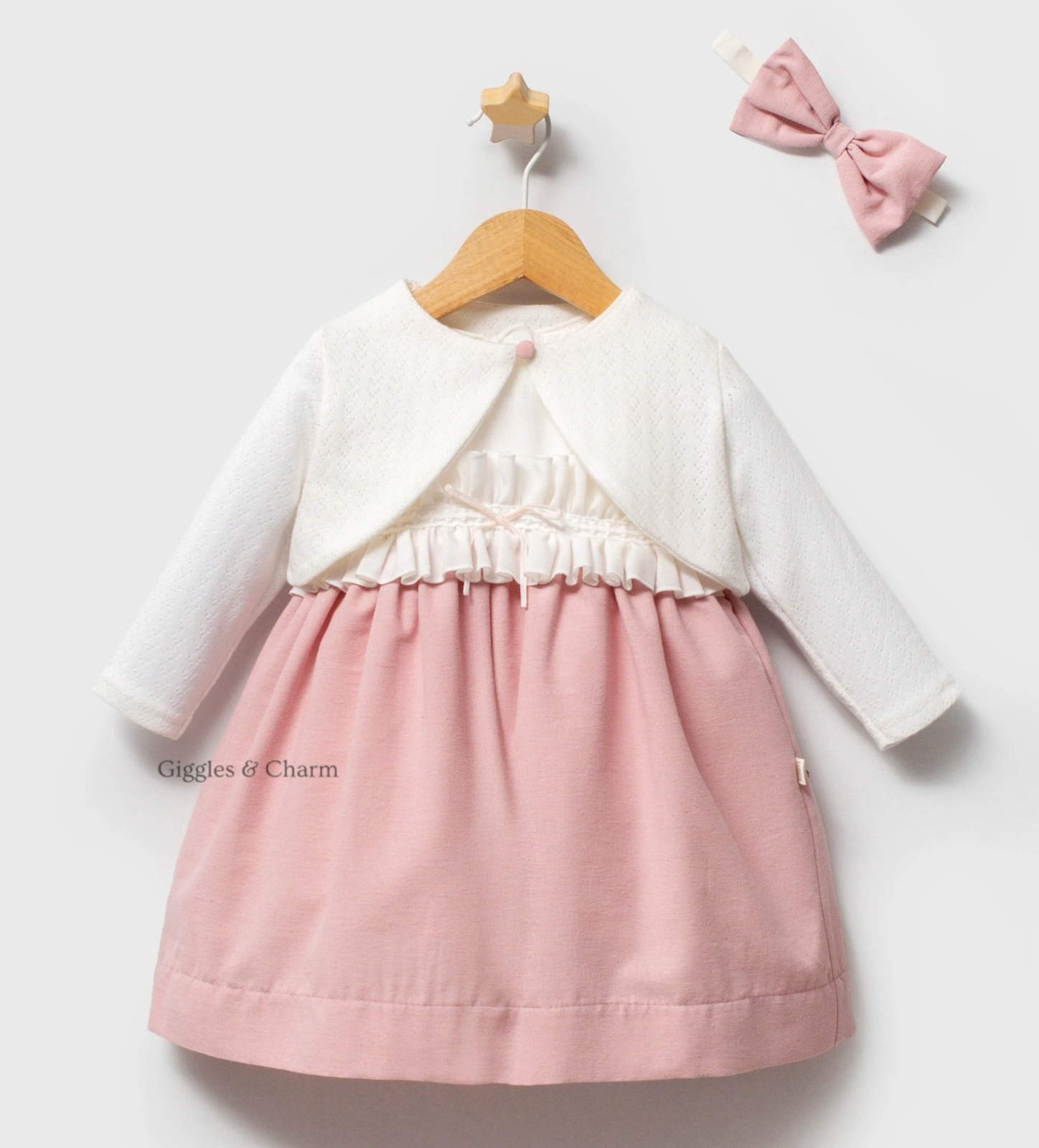 Short-sleeve dress for girls features a crisp white bodice with delicate lace-trimmed ruffle detailing across the chest and a dainty central bow. The pink gathered skirt provides a beautiful two-tone contrast, accompanied by a long-sleeve white pointelle knit Bolero cardigan for easy layering. A matching pink bow headband completes this sweet, classic ensemble ideal for special occasions.
