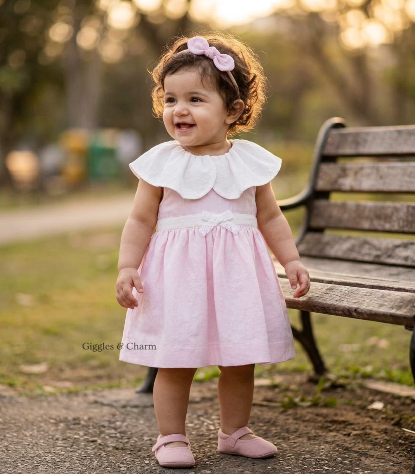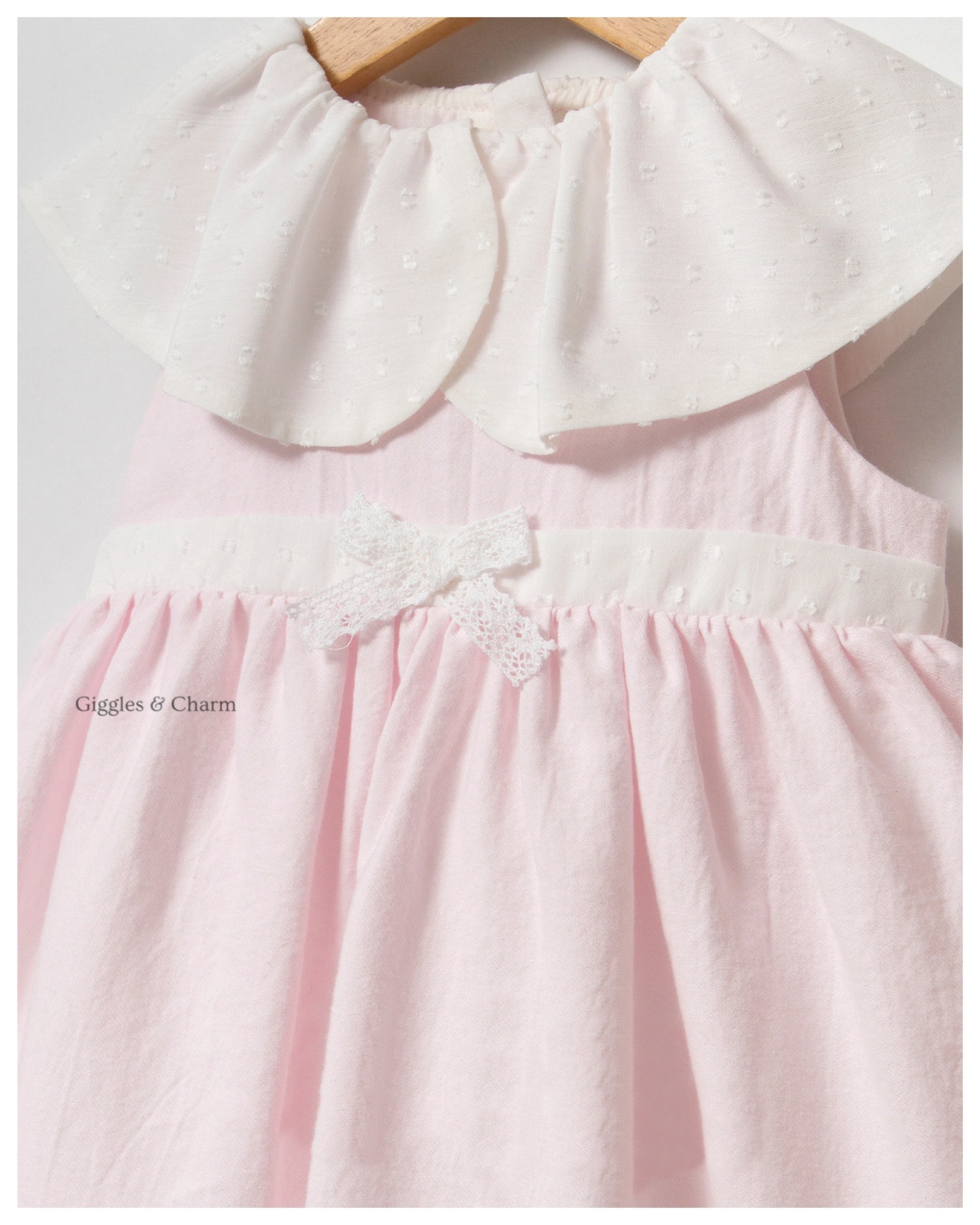 Sleeveless soft pink dress features an oversized, draped white collar with subtle textured dot detailing and delicate lace trim. A crisp white waistband adorned with a small center bow separates the bodice from the full, gathered skirt. Accompanied by a matching pink bow headband, this set offers a classic, doll-like aesthetic.