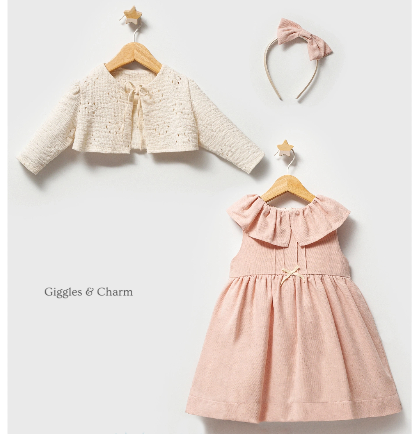 Sleeveless girls’ pink dress features an oversized, draped ruffle collar and subtle center pleats adorned with a tiny bow. Accompanied by a cream textured pointelle knit cardigan with a tie-front closure for versatile layering. A matching pink bow headband finishes this sweet, vintage-inspired look perfect for parties.