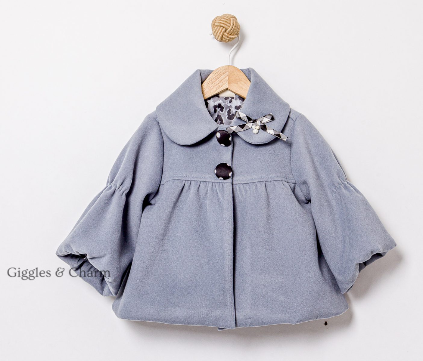 A stylish princess style coat in dusty powder blue with puffed sleeves and pretty decorative buttons. The coat features a vintage-inspired collar and a playful gingham ribbon, ensuring warmth and comfort while adding an elegant touch, making it ideal for fashion-conscious parents.