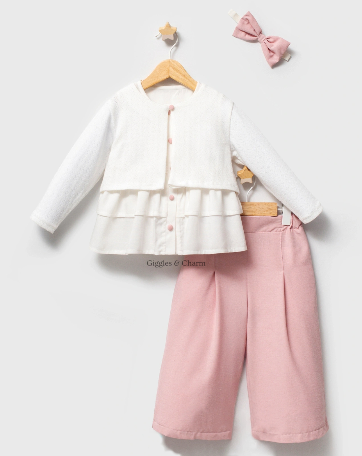 Elegant three-piece girls’ set includes a white sleeveless top with tiered ruffles at the hem, paired with wide-leg pink pleated pants. A matching white pointelle knit cardigan with pink button closures provides a sophisticated layering option. Accompanied by a pink bow headband, this versatile outfit transitions seamlessly from casual outings to dressy events.