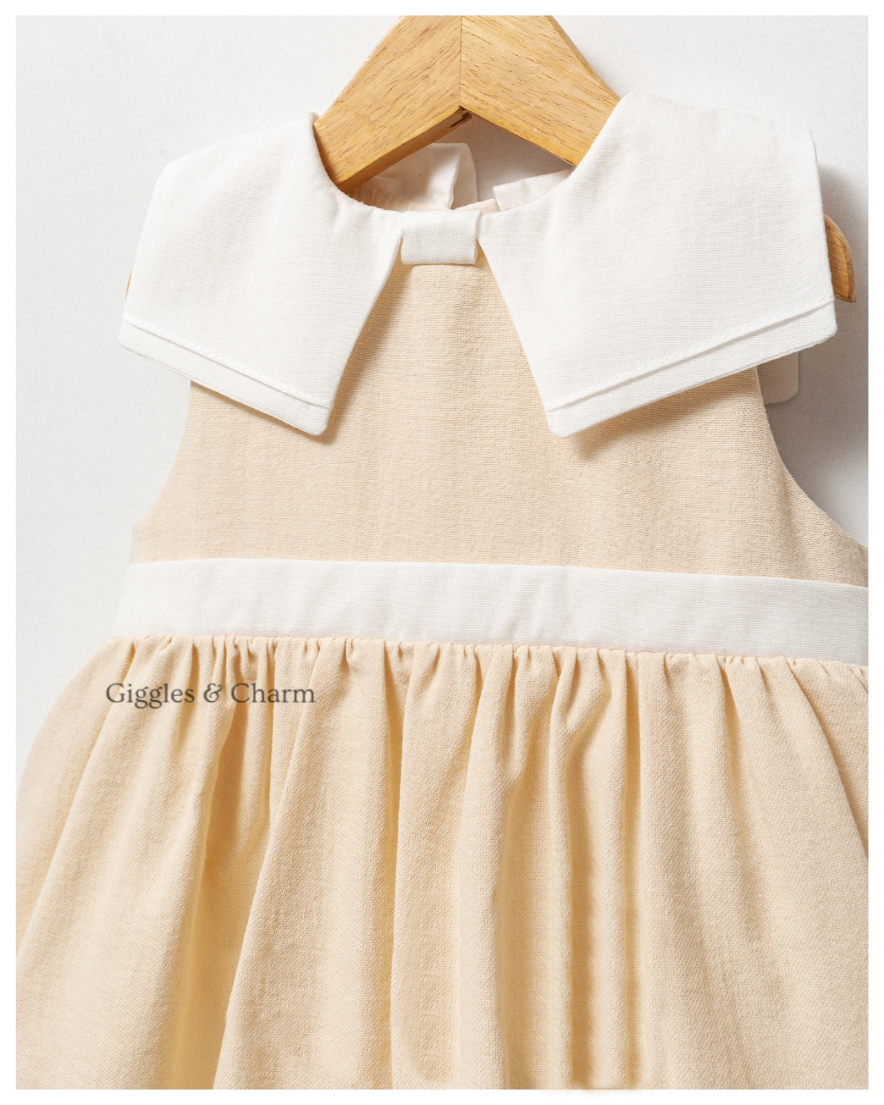 Sleeveless soft yellow dress for girls features a distinctive white split sailor-style collar and a contrasting white waistband above a full gathered skirt. The set includes a long-sleeve cream textured open-front cardigan bolero and matching yellow bow hair accessory set. The crisp white accents on pastel yellow create a fresh, nautical-inspired aesthetic.